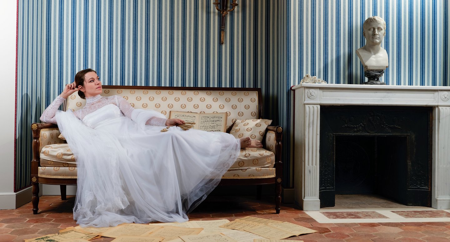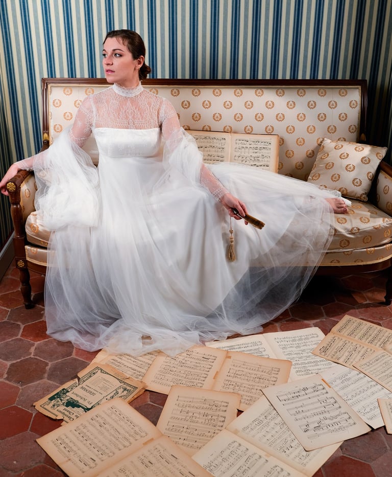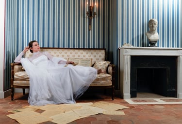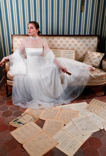The Chambre de Napoléon carried us into 1809. Napoleon I wished to revive the pastime beloved by kings: the hunt. Surrounded by faded music scores, I donned an Empire-style gown, inspired by the early 19th century.