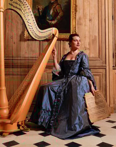 Dressed in a “robe-chemise à la reine,” I took my place at the center of this majestic space. Its perfect symmetry and generous acoustics seemed to respond to each plucked string, to every sung note. Placed at the heart of the room, the harp itself became almost architectural, extending the lines of the space. In this place that had witnessed the passage of kings and emperors, I felt entirely in my element.